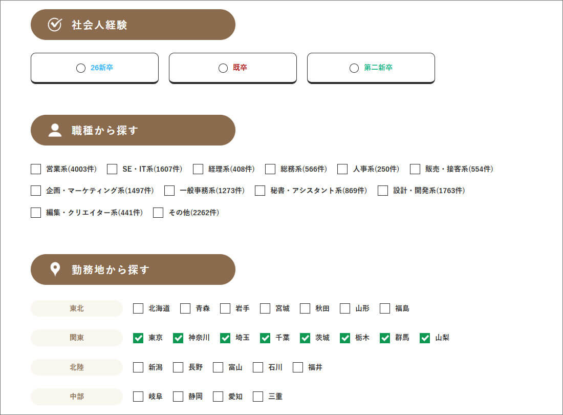 自分が決めた企業選びの軸にそって、検索条件をチェックしてみましょう。東京で働きたい人は、勤務地を東京に。こだわり条件にチェックを入れると、一致した企業が表示されます。コツは、こだわり条件を増やしたり外したりして、こまめに検索結果をチェックすること。意外な企業が出てくることも。