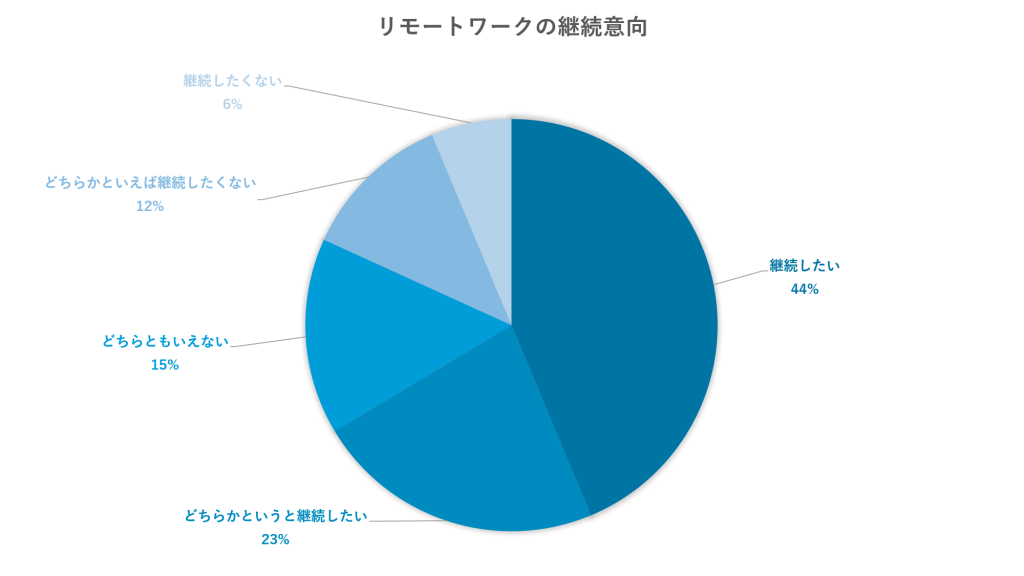 総務省公表の「第1部 特集 デジタルで支える暮らしと経済」でリモートワーク実施者に対して行った調査結果によれば「継続したい」が43.7%、「どちらかといえば継続したい」が22.7%で、合計66.4%と半数以上の割合でリモートワークを継続したいと考えている人が多いという結果になりました。